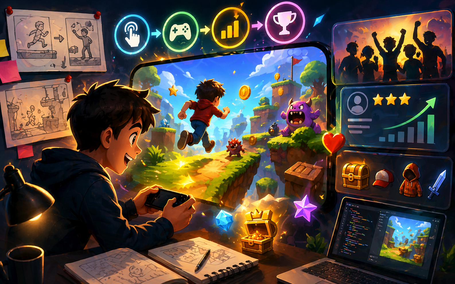 Start with the first minute, fix controls, add clear goals, balance difficulty, then layer on replay reasons, polish, and sharing. Do not try to add everything at once. Pick two or three tips, update your game, publish the new version, and see how long people play. Most builders notice big improvements after just 3–4 rounds of small changes. Players who used to stay 20 seconds now stay 3–5 minutes. Some come back the next day.